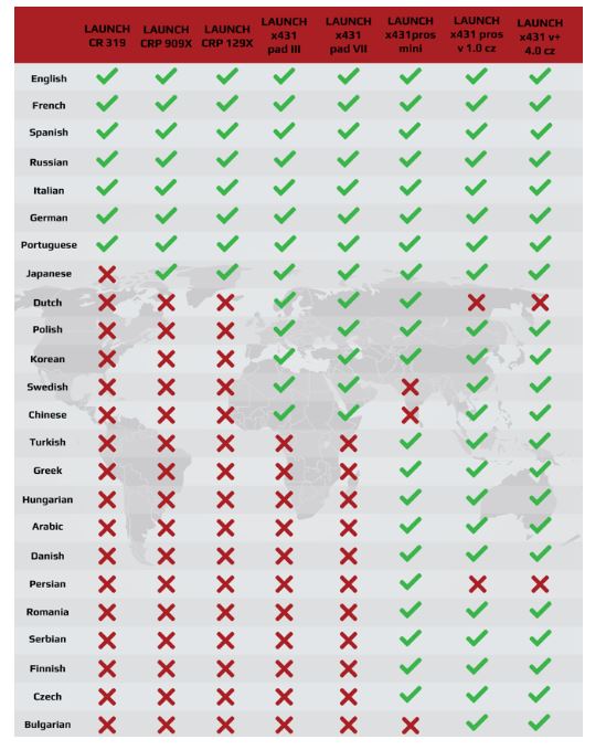 Modely autodiagnostiky Launch X431 V+ a X431 PROS V 1.0 podporují český jazyk. Naopak diagnostiky nepodporují slovenský jazyk, ale všechny modely najdete zejména v angličtině, němčině a ruštině. Abyste jako zákazník dostali přehledné informace, zpracovali jsme pro vás tabulku jazyků.